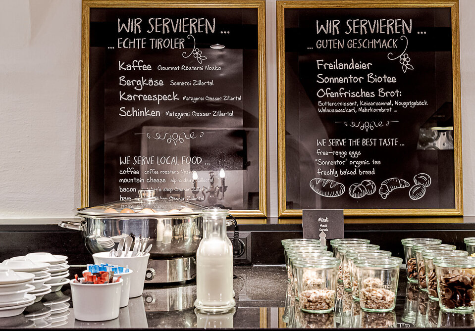 Wir haben ein feines Buffet für Sie zusammengestellt und legen dabei besonderen Wert auf regionale und gesunde Produkte: die Kaffeebohnen stammen von der Gourmetrösterei Nosko aus Innsbruck und werden Tasse für Tasse direkt vor Ihren Augen frisch gemahlen. Käse und Schinken beziehen wir aus dem Zillertal, den aromatischen Biotee liefert die Firma Sonnentor. Eiergerichte kommen frisch zubereitet zu Ihrem Tisch.